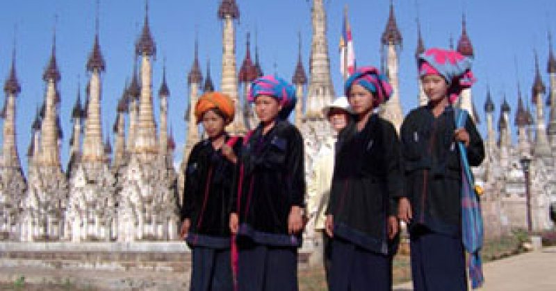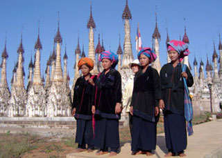 As it is. all the people of the region arrive by the thousands. dressed in their traditional costumes. Some come in bullock carts while others arrive by more modern conveyances. on the village tractor. But the most interesting time to visit this place is to get there before dawn of the full moon day of Tabaung where the Pa O people in all their finery come with gaily decorated trays bearing morning food offerings.