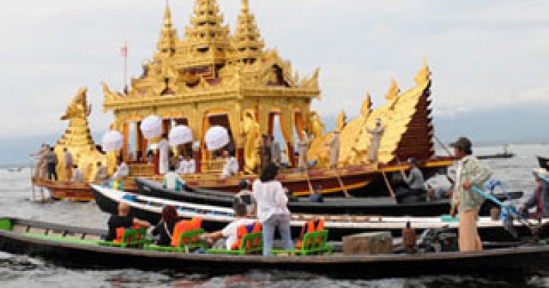 One of the famous principal shrines in Myanmar. this pagoda houses five small Buddha images. Once a year. in end Sept-early Oct.. there is a pagoda festival during which the five Buddha images are rowed around the Lake in a colourful barge. Situated in Inle Lake. one of the most dazzling and magical places in Asia. It is held on a grand scale for 18 days. usually falls in October (sometimes in September). Four Buddha Images out of five from Phaung-daw-oo Pagoda are carried on royal barge and conveyed around 14 villages on the Lake. The barge is towed by the boats of leg -rowers and hundreds of boats follow the procession. The large crowds of people gather on the lake-shores to celebrate the occasion. It is really a splendid sight.